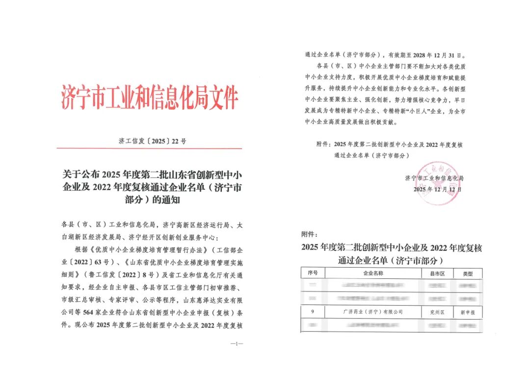 近日,济宁市工业和信息化局正式发布了《关于公布2025年度第二批山东省创新型中小企业及2022年度复核通过企业名单(济宁市部分)的通知》,广济药业(000952)(济宁)有限公司凭借坚实的创新实力与稳健的发展态势,成功入选“山东省创新型中小企业”名单。