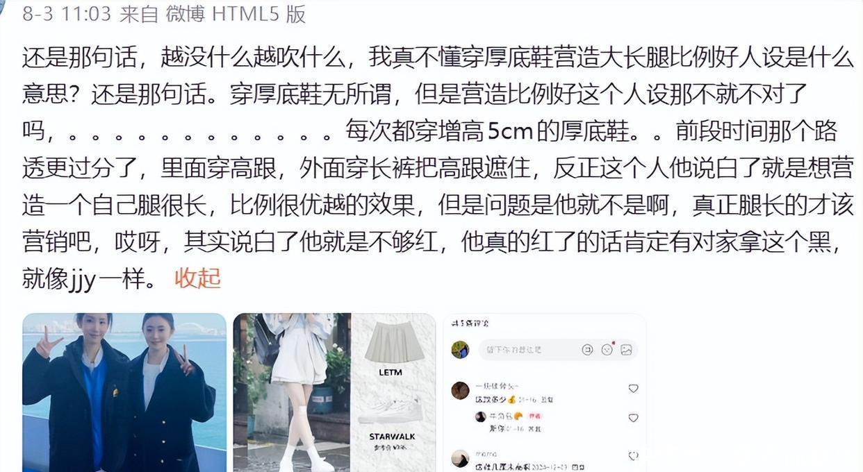 还有网友截图她在剧里的鞋跟,讽刺她伪精致,连拍戏都要穿厚底增高鞋。