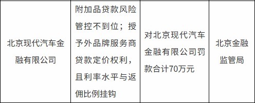 【大河财立方消息】11月8日消息,国家金融监督管理总局北京监管局近日披露行政处罚信息,因附加品贷款风险管控不到位;授予外品牌服务商贷款定价权利,且利率水平与返佣比例挂钩,北京现代汽车金融有限公司被罚70万元。