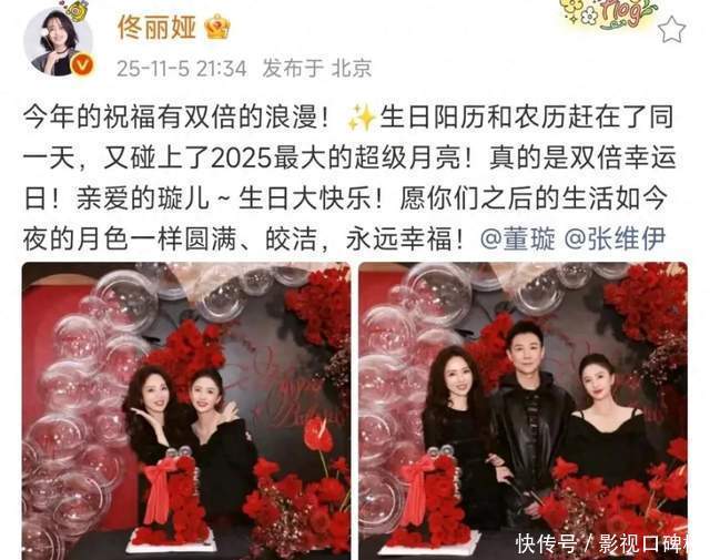 知名演员佟丽娅更新了社交平台,文案是:双倍浪漫+超级月亮!从她晒出的照片中看,原来为好闺蜜董璇庆祝46岁生日。